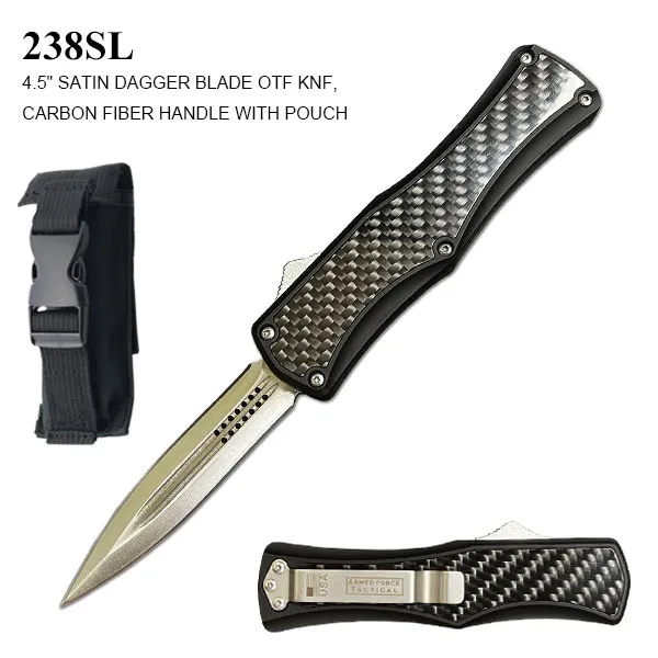 The 238SL Carbon Fiber Dagger Blade OTF (Out-The-Front) knife is a sleek and high-performance knife designed for tactical and everyday carry purposes. It features a unique carbon fiber handle and a sharp dagger-style blade.