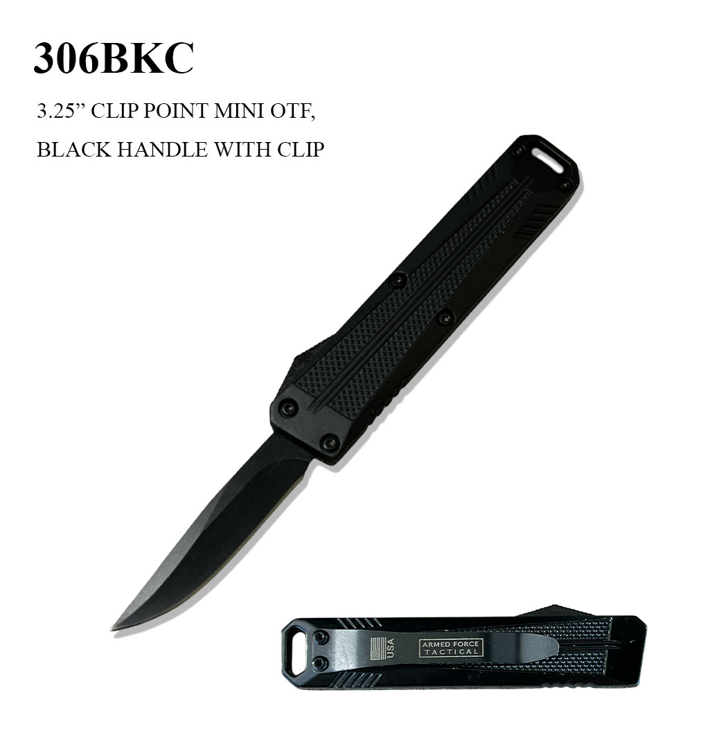 Home / Knives / OTF Knives / 306BKC 5″ OTF KNIFE New 306BKC 5″ OTF KNIFELogin SKU: 306BKC Categories: All Products, Knives, OTF Knives Tags: DAGGER BLADE, KNIFE, OTF, POCKET KNIFE Product ID: 337676 Description Additional information Reviews (0) Description 306BKC 5″ OTF KNIFE OTF AUTOMATIC KNIFE 3.25″ CLOSED, 5″ OVERALL, STAINLESS STEEL CLIP POINT, BLACK ZINC ALLOY HANDLE WITH CLIP Additional information Color Black Reviews There are no reviews yet. Only logged in customers who have purchased this product may leave a review.