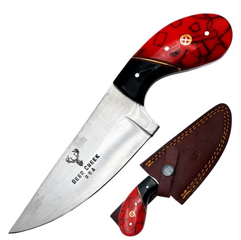 DC 007 7.25″ Deer Creek Black & Red Short Handle Skinner Knife with Leather Sheath